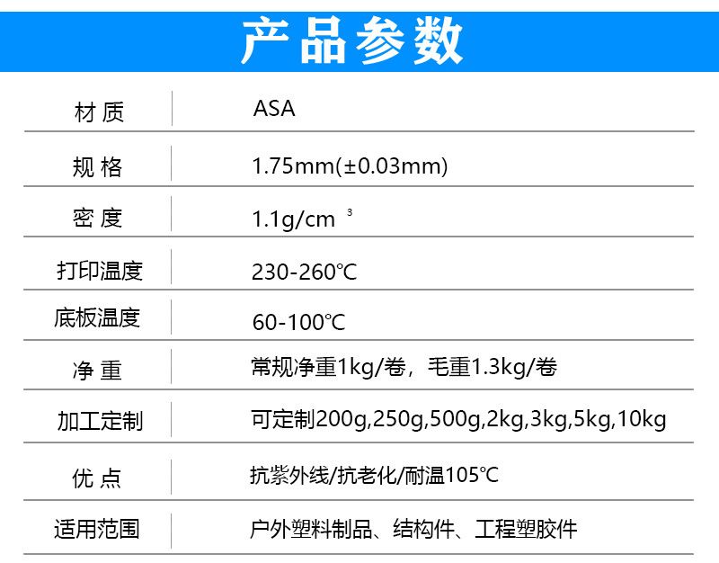 規格 ASA 紅色, ASA 灰色, ASA 白色, ASA 黑色, ASA 藍色 商品評價 目前沒有評價。 搶先評價 “品銳 PINRUI 3D 列印 線材 ASA 抗曬 抗老化 耐高溫 asa 3D 打印”取消回覆你必須登入才能發表評論。